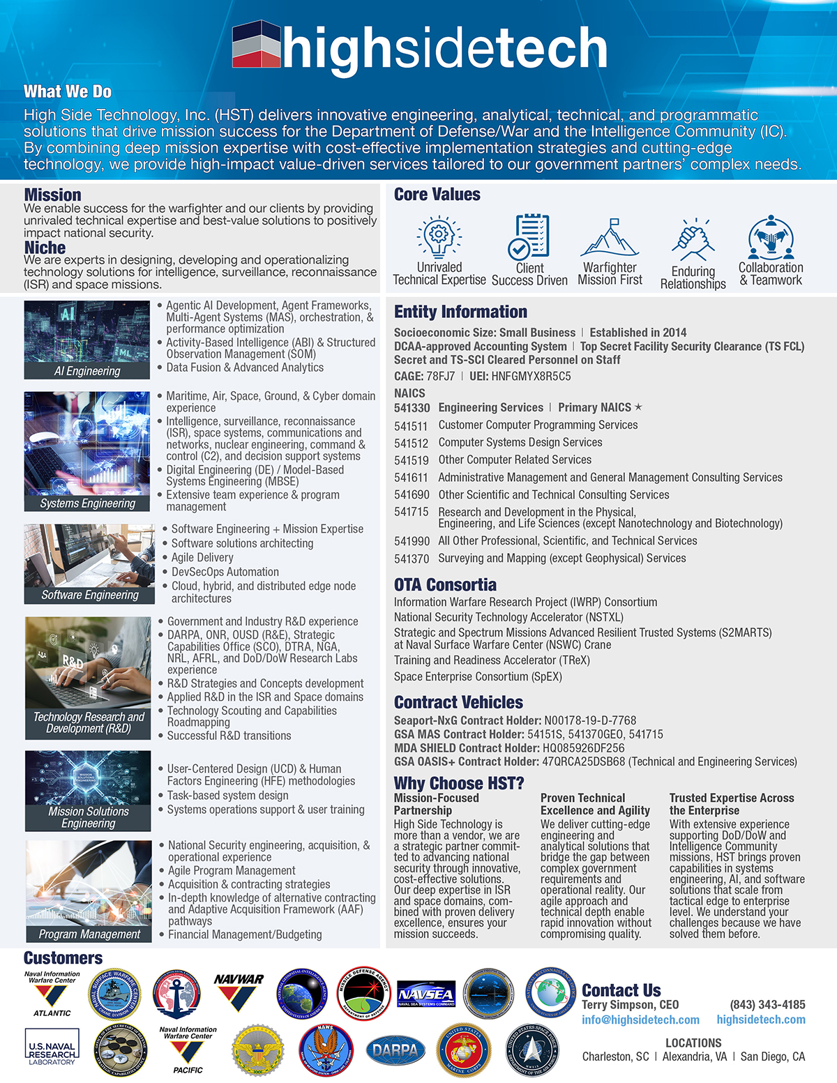 Thank you for your interest in High Side Technology. Our Corporate Capability document offers comprehensive insights into our NAICS codes, contracting vehicles, and unique capabilities. To request a copy, email us at info@highsidetech.com and our team will send you the PDF. We look forward to showing how High Side Technology can provide high-quality engineering, technical, operational, and programmatic support services.